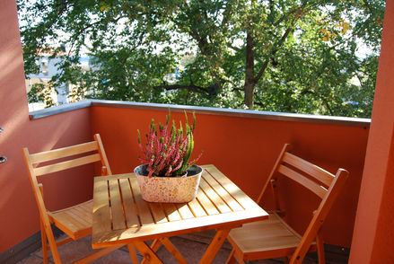 mit Balkon und ein Bad mit Badewanne. Die Möbel sind vorwiegend aus Echtholz.